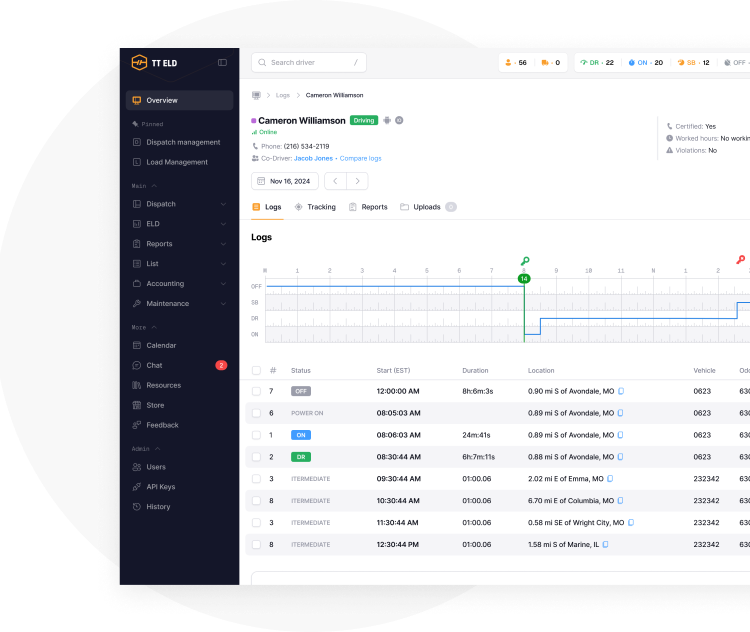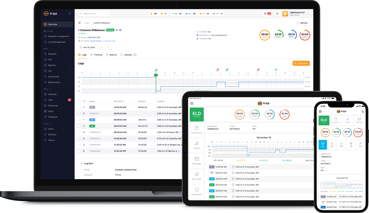 Answer: An electronic logging device (ELD) connected to the vehicle collects data directly from the CMV’s engine. The data may include the status of engine power (on/off), the speed, how long the engine has been operating, how many miles have been covered, and other additional data. Then, this data is sent to the TT ELD application that demonstrates this information and enables drivers or loggers to enter some supplementary information.